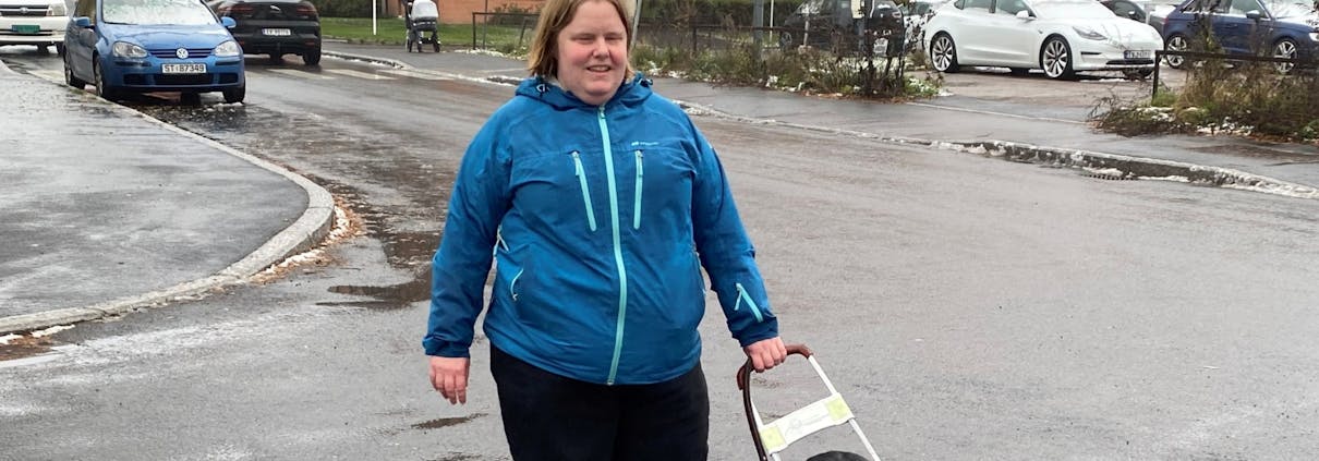 Vi kommer til et veikryss, og hunden min stopper på fortauskanten slik hun har lært. Jeg føler meg ganske sikker på hvor vi befinner oss, så jeg kommanderer henne over til det andre fortauet. Plutselig skjærer Raja ut i en underlig kurve. Den gode flyten er som blåst vekk. Bestemt sier jeg «Retning!» i et forsøk på å hindre at vi mister forståelsen av hvor vi er. Det hjelper ikke, og jeg blir redd. Vi går i veibanen et stykke og en bil kommer kjørende mot oss. Jeg rekker å se for meg at vi begge blir påkjørt. Nå er jeg virkelig redd! Men jeg kan ikke slippe bøylen og prøve å gå alene, for jeg aner ikke hvor det er trygt å gå.